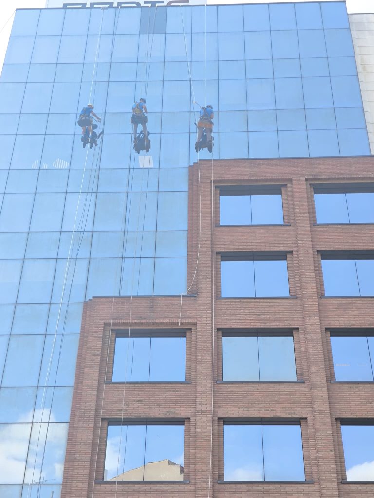 Cristales relucientes en altura gracias a técnicas especializadas y sistemas de seguridad certificados.